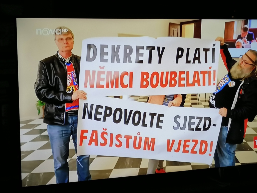 „My Češi jsme konkrétně tímto sjezdem ohroženi. Pochopme, co se stalo v Mnichově, kdo to byl Konrad Henlein a s kým to měl domluvené – s Hitlerem a s NSDAP,“ nechal se slyšet pan Jasek, který přijel protestovat až z Ostravy.