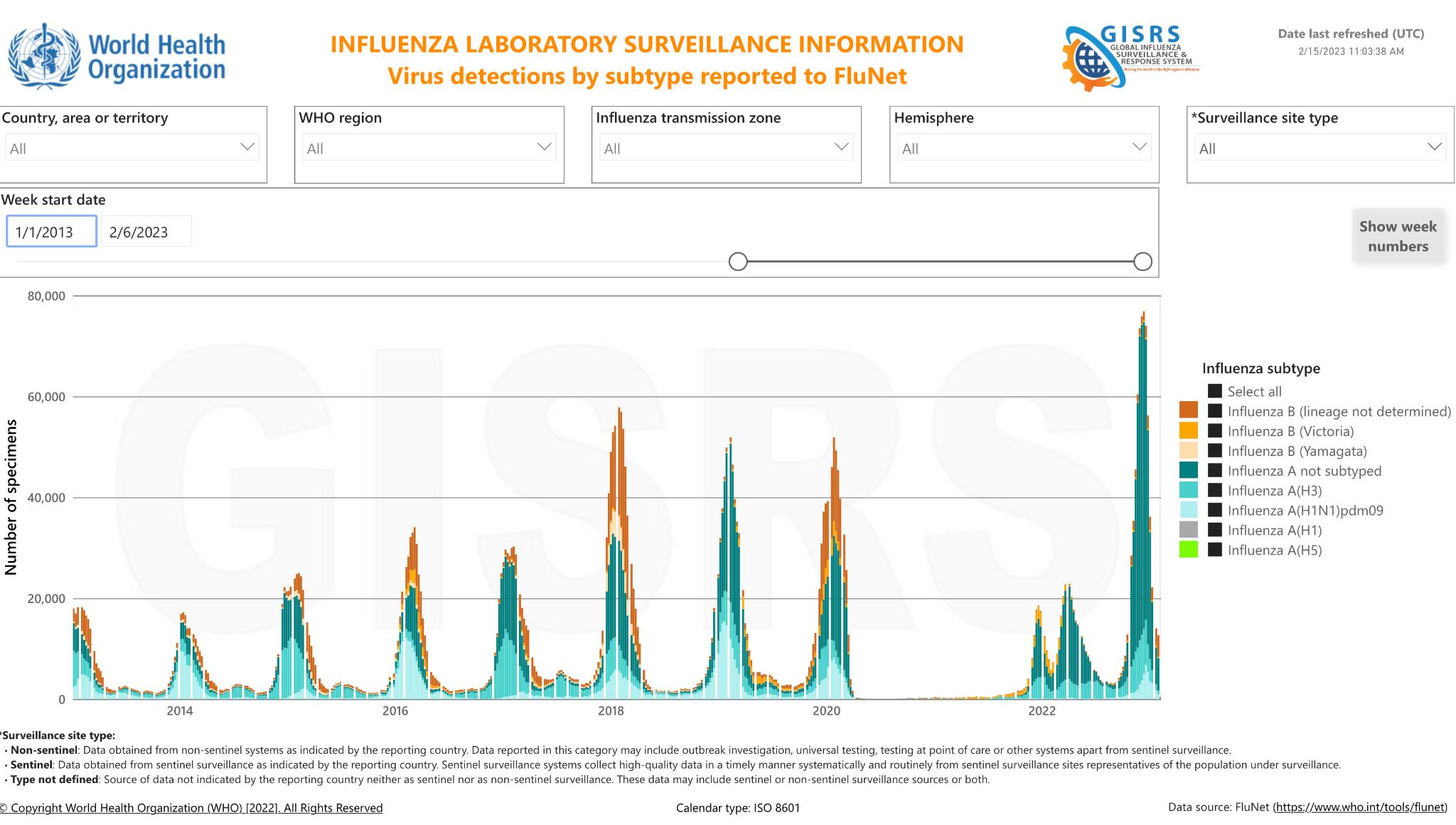 Světová zdravotnická organizace zveřejní data, ze kterých vyplývá, že v roce 2021 nebyl na celé planetě zjištěn téměř žádný výskyt viru chřipky. Chřipka se vrátila v roce 2022. Viz graf níže.