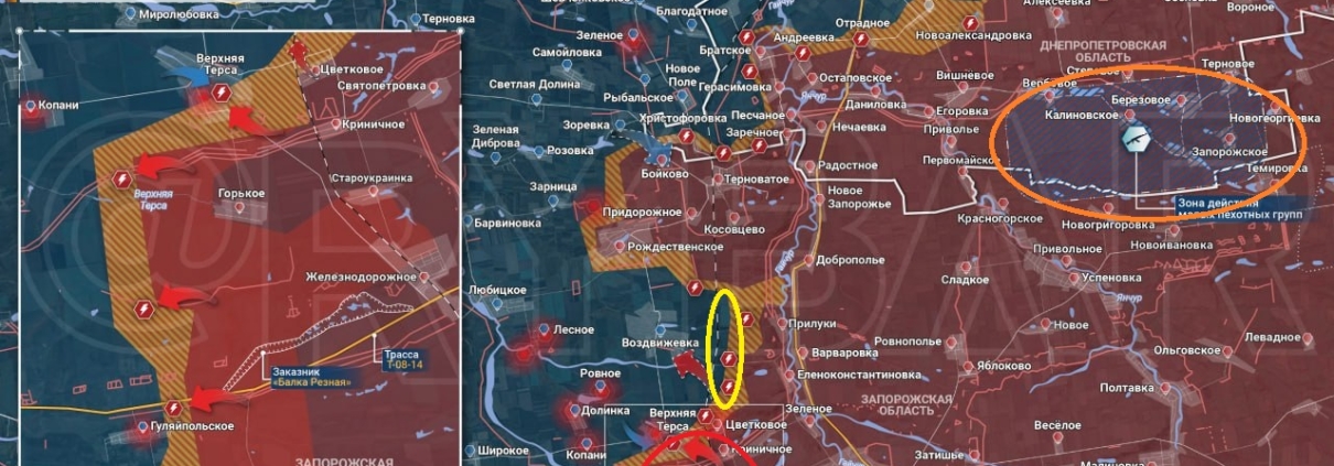 Vše však byl jen sprostý bluf na prosté Ukrajince. Aby generál Syrskyj mohl šílený rozkaz Zelenského vůbec splnit, musel z jižního úseku fronty proti ruské operační skupině VÝCHOD stáhnout veškeré ukrajinské obrněné a elitní formace. A pokud se podíváte na mapu nahoře potřetí, tyto elitní jednotky byly staženy z obrany právě v místě, které jsem na mapě označil červenou elipsou.
