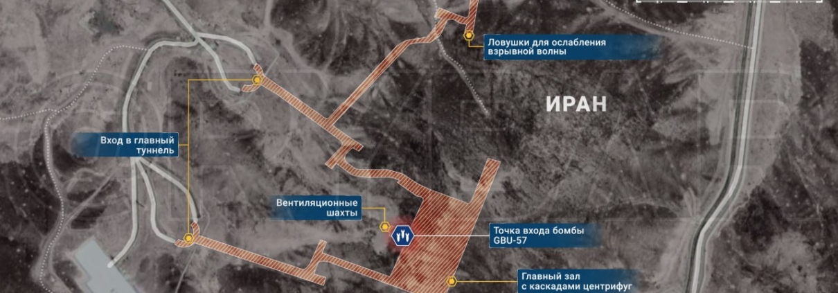 Mapa zachycuje Trumpovy bombardovací útoky proti iránskému centru obohacování uranu v podzemním bunkru Fordow. Podle ruských tvrzení nejméně jedna bomba zasáhla ventilační šachtu, a je tak možné, že objekt poškodila. Bunkr je nejméně 100 metrů pod povrchem, a US bomby GBU-57 by tak podle všech svých známých charakteristik do něj neměly proniknout.