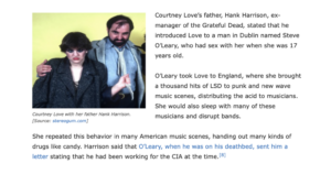 Courtney vyrůstala v rámci programu MKUltra… byla do něj zapojena už od dětství. A nedávno odtajněné spisy FBI o skupině Nirvana odhalují, že její otec přiznal, že ji připravoval agent CIA jménem Steve O’Leary. Spis to všechno odhaluje: byla naprogramována – vycvičena k plnění rozkazů CIA. Její mise? Infiltrovat hudební svět… a zaplavit scénu tisíci dávkami nových, psychotropních drog. Agentura chtěla mít kontrolu – nad kulturou, rebelstvím, umělci. Rozdávala je jako bonbóny, přesně tak, jak to po ní její nadřízení požadovali.